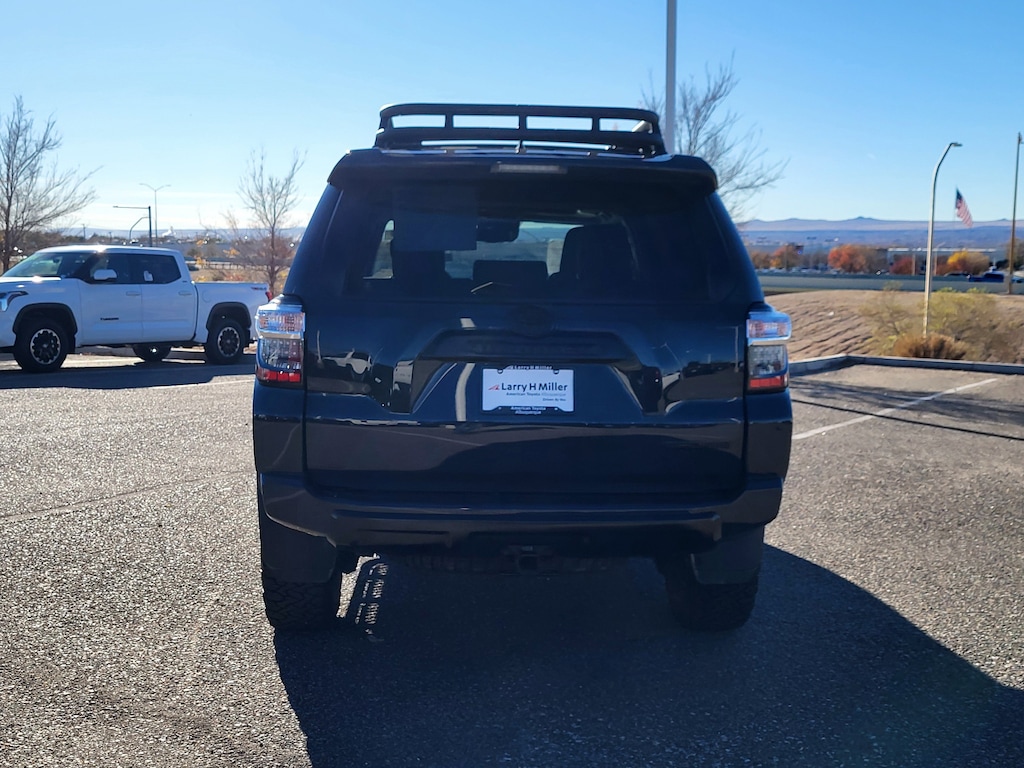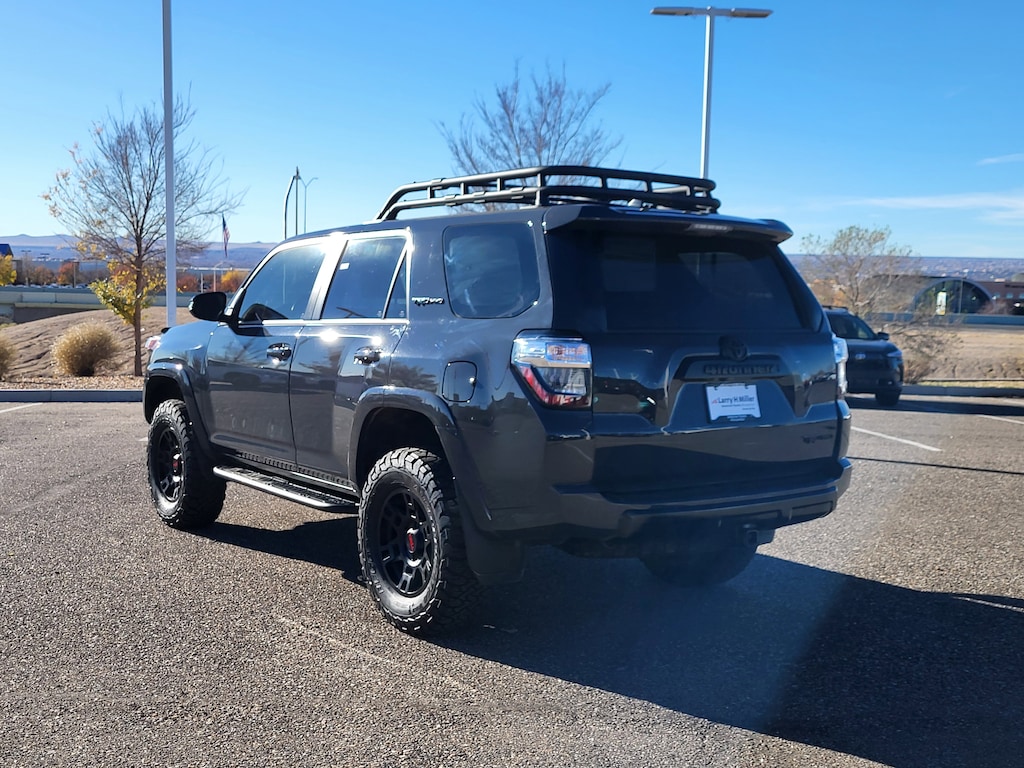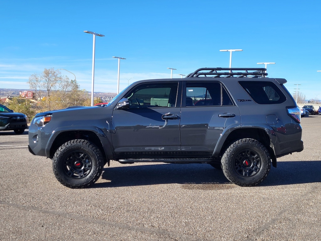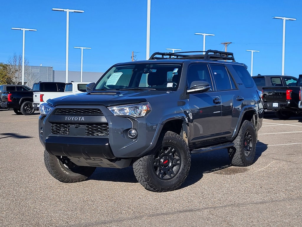 TRD Pro Package (Black Lug Nuts, Dual Zone Auto Climate Control, Fog Lights, Fox Shocks, Garage Door Opener, Heated Outside Rear-View Mirrors, Moonroof w/Tilt Up & Slide, Multi-Terrain Back Monitor, Roof Rack, TRD Pro All Weather Floor Liner, TRD Pro Badging, TRD Pro Exhaust, TRD Shift Knob, and Wheel Locks), Toyota Gold Certified Certified, 4WD, Black/Graphite w/Leather Seat Trim, 15 Speakers, 3.727 Axle Ratio, 4-Wheel Disc Brakes, ABS brakes, Air Conditioning, Alloy wheels, AM/FM radio: SiriusXM, Anti-whiplash front head restraints, Apple CarPlay/Android Auto, Auto High-beam Headlights, Auto-dimming Rear-View mirror, Automatic temperature control, Blackout Emblem Overlays (TMS), Brake assist, Bumpers: body-color, Compass, Dashcam (TMS), Door Edge Guard (TMS), Driver door bin, Driver vanity mirror, Dual front impact airbags, Dual front side impact airbags, Electronic Stability Control, Emergency communication system: Safety Connect (1-year trial), Exterior Parking Camera Rear, Front anti-roll bar, Front Bucket Seats, Front Center Armrest, Front dual zone A/C, Front fog lights, Front reading lights, Front wheel independent suspension, Garage door transmitter: HomeLink, Heated door mirrors, Heated Front Bucket Seats, Heated front seats, Heated steering wheel, Illuminated entry, Knee airbag, Leather Shift Knob, Low tire pressure warning, Navigation System, Occupant sensing airbag, Outside temperature display, Overhead airbag, Overhead console, Paint Protection Film (TMS), Panic alarm, Passenger door bin, Passenger vanity mirror, Power door mirrors, Power driver seat, Power moonroof, Power passenger seat, Power steering, Power windows, Predator Tube Step (TMS), Radio: Premium Audio w/JBL, Rear anti-roll bar, Rear seat center armrest, Rear window defroster, Rear window wiper, Remote keyless entry, Roof rack, Security system, SofTex Seat Trim, Speed control, Speed-sensing steering, Split folding rear seat, Spoiler, Steering wheel mounted audio controls, Tachometer, Telescoping steering wheel, Tilt steering wheel, Traction control, Trip computer, Variably intermittent wipers, and Wheels: 17 Matte Black Flow-Formed TRD Alloy.